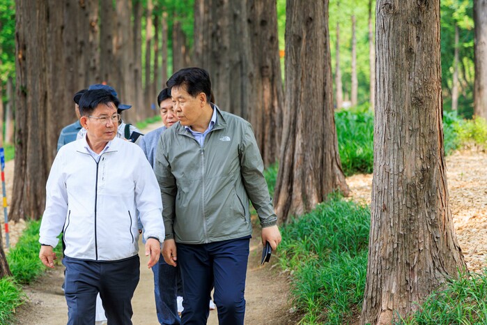 | ▲ 지난 6월 난지 테마관광 숲길 조성을 위한 현장점검에 나선 박강수 구청장(앞쪽 왼쪽)의 모습. (사진=마포구청 제공) |