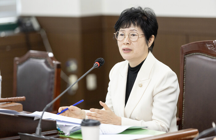 | 안산시의회 박은경 의원이 지난 10월 16일 제285회 임시회 의회운영위원회에서 발언하고 있는 모습. 사진제공=안산시의회 |