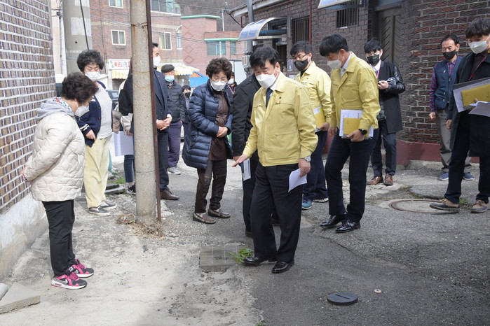 서울 동두천시는 지난 31일 해빙기를 맞아 8개동 28곳 주요 민원현장 및 안전·생활 취약지역 현장방문을 실시했다. 시는 로드체킹을 통해 지역의 애로사항을 파악해 개선책을 마련하는 등 적극행정을 지속 추진할 방침이다. 사진은 최용덕 시장(앞쪽 오른쪽)이 관계자들과 현장을 방문하고 있는 모습.(사진제공=동두천시청)