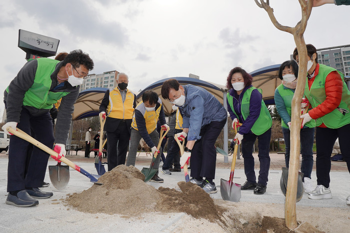 서울 동대문구는 제77회 식목일을 앞둔 지난 31일 중랑천 둔치를 찾아 주민들과 함께 ‘2022년 동대문구 나무심기’ 행사를 진행했다. 중랑교~이화교 1km 구간에 백목련 등 4종·525주를 심었다. 사진은 유덕열 구청장이 주민들과 함께 나무를 심고 있는 모습. (사진제공=동대문구청)