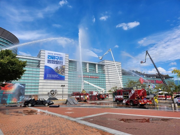 훈련은 롯데마트·아울렛 광주월드컵점 지상 2층에서 원인 미상의 화재, 폭발로 인한 대형화재 발생과 2차 폭발에 의한 붕괴, 유해화학물질 누출 등 복합재난 발생으로 다수의 인명피해가 발생한 상황을 가정해 진행됐다.