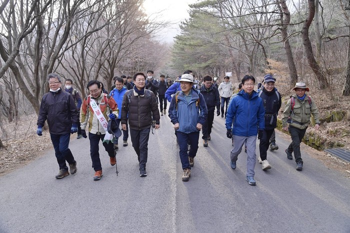 | ▲ 강기정 광주광역시장(가운데)이 4일 오전 올해 첫 무등산 정상 개방행사에 참여해 탐방객들과 무등산 정상을 향해 오르고 있다./광주광역시 제공 |