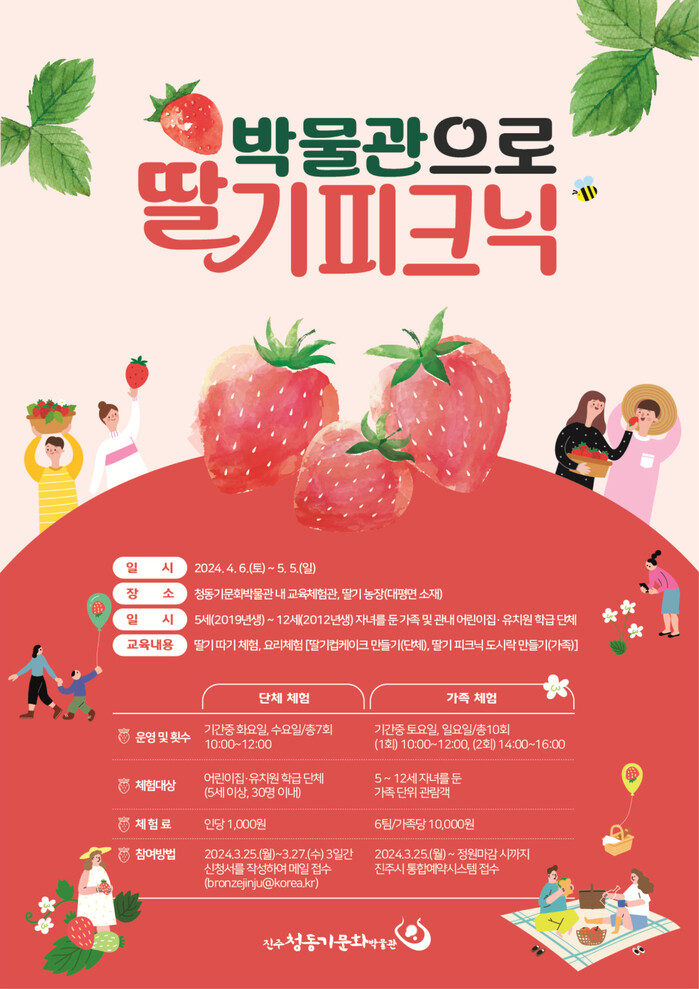 진주청동기문화박물관은 4월 6일부터 5월 5일까지 어린이집·유치원 등 단체와 가족단위 방문객을 대상으로 딸기 체험 프로그램을 운영한다.