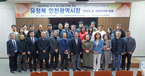 [인천=김형만 기자] 인천대학교 경영대학원은 11월 27일 오후 7시 인천대학교 교수회관 대회의실에서 유정복 인천시장을 초청해 최고경영자과정(CEO) 제20기 특강을 개최했다고 밝혔다.
