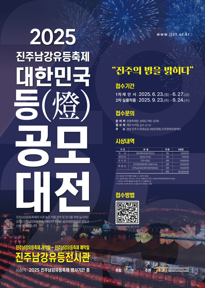 진주시가 주최하고 (재)진주문화관광재단이 주관하는 「2025 진주남강유등축제 대한민국 등(燈)공모대전」이 ‘진주의 밤을 밝히다'라는 주제로 개최된다.