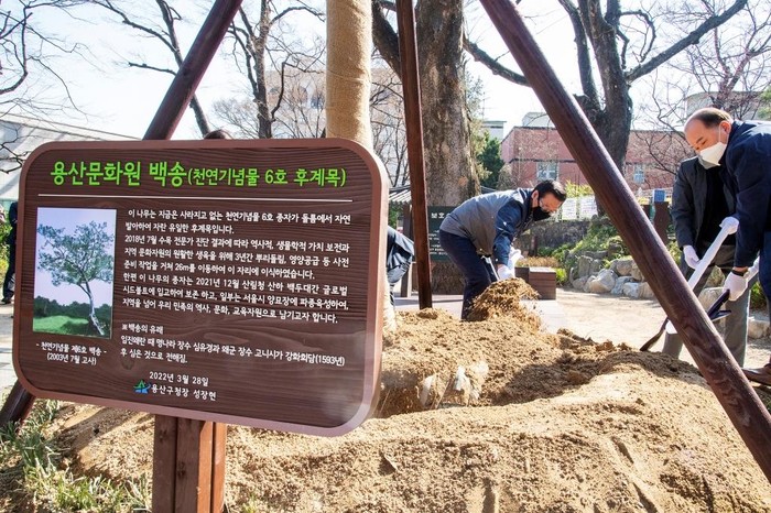 서울 용산구는 지난 28일 용산문화원 정자마당에서 천연기념물 제6호였던 백송 후계목 이식 행사를 열었다. 1593년 임진왜란 당시 일본과 명나라의 강화협정을 기념해 심었다고 전해지는 원효로 백송의 유일한 후계목이다. 사진은 성장현 구청장(왼쪽)이 천연기념물 6호 후계목 이식 기념식수를 하고 있는 모습.(사진제공=용산구청)