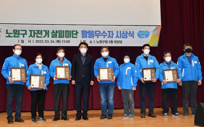 서울 노원구가 지난 24일 6개월 동안 안전한 자전거타기 환경 조성에 크게 기여한 노원거자전거살피미단 활동우수자 표창 수여식 및 간담회를 개최했다. 사진은 이날 오승록 구청장(왼쪽 네 번째)이 노원거자전거살피미단 우수활동 시상자들과 기념촬영을 하고 있는 모습. (사진제공=노원구청)