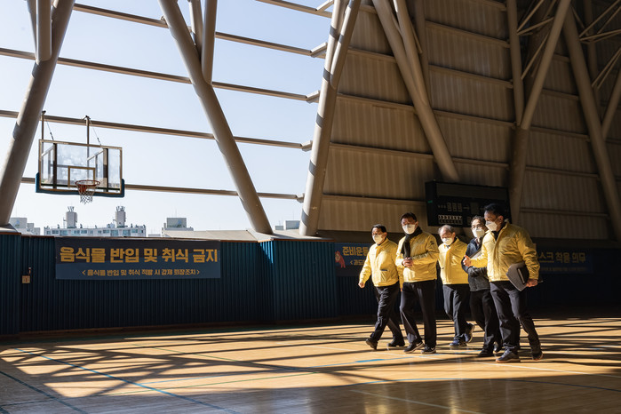 김선갑 서울 광진구청장은 지난 17일 강풍에 의해 외벽 판넬 일부가 추락한 광장동 소재 구민체육센터를 방문해 직접 현장점검에 나섰다. 사진은 김 구청장(왼쪽에서 두 번째)이 관계자들과 구민체육센터 내부 점검을 하는 모습.(사진제공=광진구청)