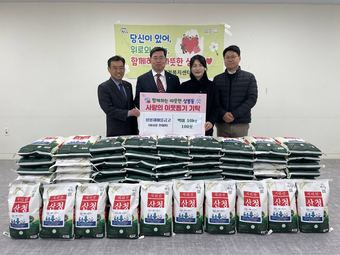한편, 상봉새마을금고는 지난 추석에도 백미(10kg) 100포를 기탁하는 등 명절마다 지역의 어려운 이웃들을 위한 기부활동을 꾸준히 이어오고 있으며, 지역사회 나눔문화 확산을 위해 노력하고 있다.