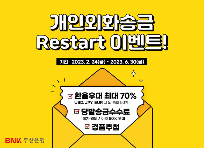 [시민일보 = 여영준 기자] BNK부산은행은 24일부터 오는 6월30일까지 ‘개인외화송금 Restart 이벤트’를 실시한다고 밝혔다.