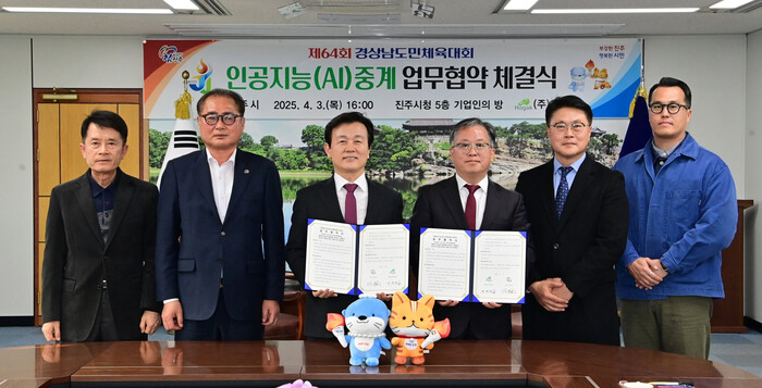 진주시는 3일 시청 기업인의 방에서 스포츠 인공지능(AI) 중계업체인 ㈜호각(HOGAK)과 업무협약을 체결하고, 경남도민체전 기간 펼쳐지는 인기종목의 경기에 대해 진주시 공식유튜브 채널을 통해 AI 생중계 및 다시보기를 실시한다고 밝혔다.