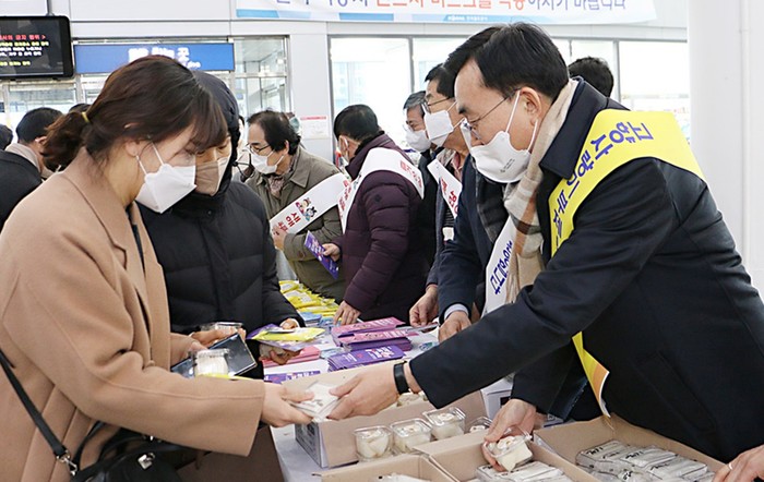 나주시는 이날 오후 KTX나주역 대합실에서 농협중앙회 나주시지부(지부장 신경훈) 나주시조합운영협의회와 함께 설 명절 귀성객 맞이 행사를 가졌다고 밝혔다.