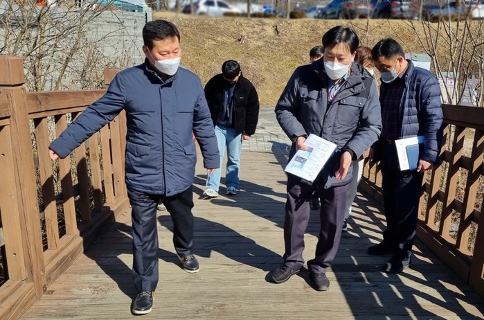김선재 경기 수원시 영통구청장은 지난 2일 주민불편 해소를 위해 하동 일원의 주요사업 대상지에 대한 현장점검을 실시했다. 이날 김 구청장은 보도단절 구간 보도조성 대상지 등을 둘러보며 문제점을 확인했다. 사진은 김 구청장(왼쪽)이 관계자들과 현장 점검을 하는 모습.(사진제공=영통구청)