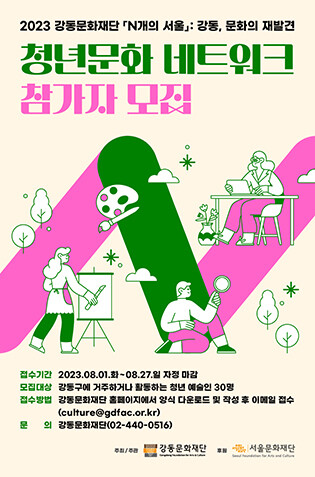 [시민일보 = 이대우 기자] 서울 강동문화재단(이사장 이수희)이 오는 9월부터 강동구 청년과 청년 예술인들이 지역문화를 폭넓게 이해하고 경험할 수 있도록 돕는 ‘청년문화 네트워크’ 사업을 추진, 참가자를 모집한다.