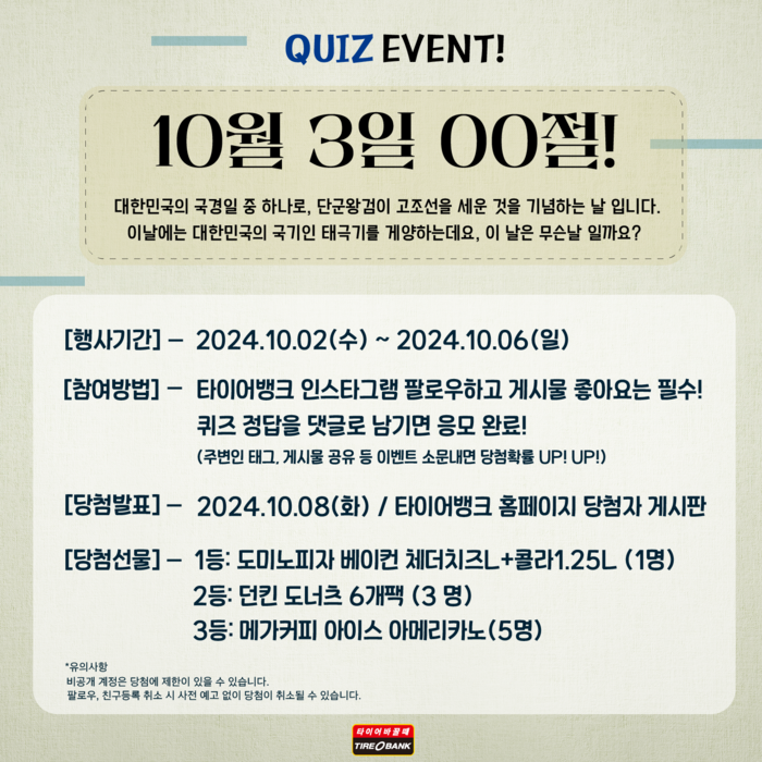 이벤트는 10월 2일(수)부터 10월 6일(일)까지 5일간 진행되며 타이어뱅크 공식 인스타그램 팔로우 후 퀴즈 정답을 이벤트 게시물에 댓글로 남기면 참여 가능하다.