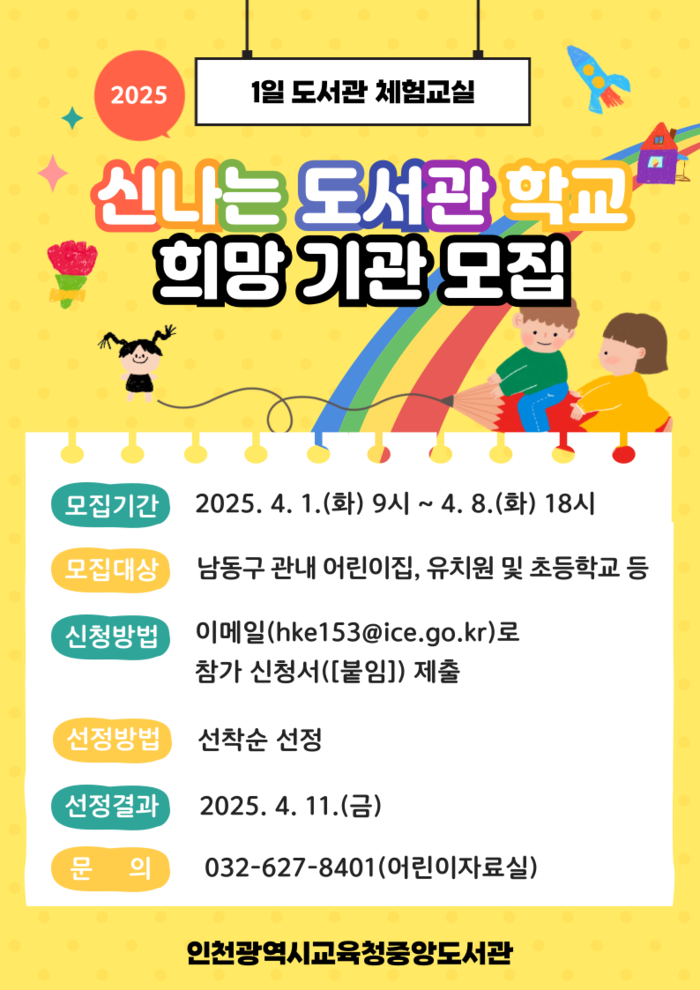 참여를 희망하는 학교 및 기관은 4월 1일부터 8일까지 선착순으로 신청 가능하며, 자세한 사항은 인천중앙도서관 홈페이지 또는 어린이자료실로 문의하면 된다.