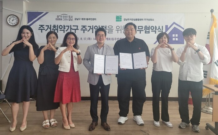 이기선 개포1동장은 “폭염과 호우 등 자연재해로 인해 주거 취약계층의 어려움이 가중되고 있다”며 “이번 협약을 통해 주거 분야의 복지 상담을 강화해 주민들이 더 안전한 주거 환경에서 살 수 있도록 지원해 나가겠다”고 말했다.