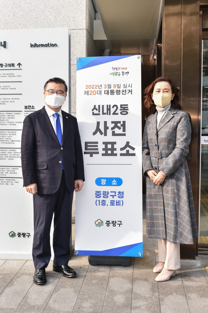 류경기 서울 중랑구청장이 4일 중랑구청내 사전투표소에서 제20대 대통령선거 사전투표에 참여했다. 사진은 이날 사전투표에 참여한 류 구청장(왼쪽)과 부인 강영숙씨가 기념촬영을 하는 모습.(사진제공=중랑구청)