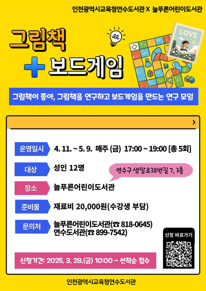 이번 프로그램은 늘푸른어린이도서관의 ‘그림책을 좋아하고 그림책으로 노는 법을 연구하는 모임’이 주관하며, 4월부터 ‘그림책+보드게임’ 프로그램을 운영한다.