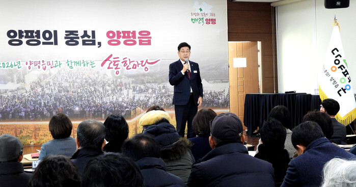 이어 2026년 양평읍의 주요 계획으로 △경제 우선 전략에 따른 양평시장 상권 활성화 △남한강 테라스와 연계한 물안개공원, 갈산공원 등 관광자원화 형성 △양근천, 쉬자파크, 백운봉을 잇는 관광개발 마스터플랜 수립 △양근대교 확장 등 광역도로망 확충 계획 등을 제시하며 중장기 발전 방향을 설명했다.