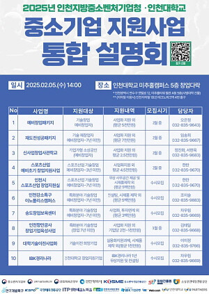 [인천=김형만 기자] 국립대학법인 인천대학교가 인천지방중소벤처기업청과 함께 2월 5일 수요일 14시부터 인천대학교 미추홀캠퍼스 창업다락 5층에서 “25년도 중소기업 지원사업 통합 설명회”를 개최한다.