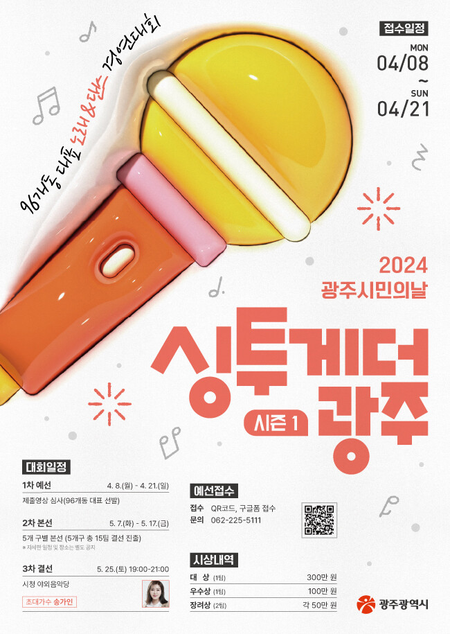 이어 자치구별 본선 경연을 거쳐 결선 진출자 15명(팀)을 최종 선발하고, 오는 5월 24일 열리는 ‘광주 시민의 날’ 본무대에서 결선을 진행한다. 결선에서는 대상·우수상·장려상 등 4명(팀)을 최종 선발해 총 500만 원의 시상금을 준다.