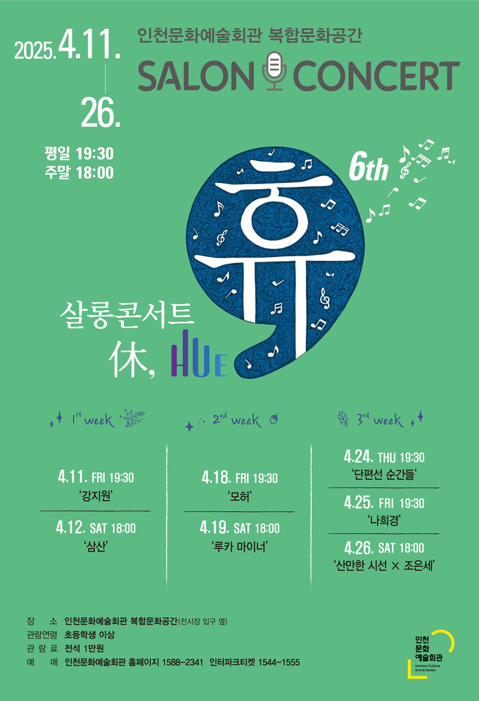뚜렷한 개성과 깊은 음악성으로 무장한 2025 살롱콘서트 ‘휴’(休, HUE)는 회차당 100석이 오픈되며, 인천문화예술회관 누리집과 인터파크 티켓을 통해 예매가능하다. 회차당 전석 1만원이다.