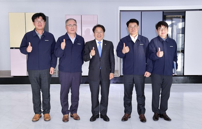 | ▲ 강기정 광주광역시장(가운데)이 16일 오후 광산구 하남산단 삼성전자 광주사업장 1공장에서 진행된 정책소풍에 참석해 냉장고 전시장에서 이상훈 삼성전자 스마트공장 지원센터장 등과 기념촬영을 하고 있다. /광주광역시 제공 |