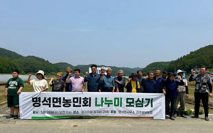이날 행사에는 명석면 농민회 회원들과 유관기관 단체장 등 50여 명이 참여해 2,310㎡ 면적의 논에 모를 심으며 구슬땀을 흘렸다. 행사에 사용된 모판 80개는 진주북부농협이 후원했으며, 명석면 농약사도 20만 원 상당의 제초제를 지원하여 지역 상생의 의미를 더했다.