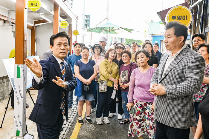 진주시는 16일 상대지구 도시재생사업의 일환으로 추진하고 있는 ‘진주 자유시장 경관개선사업’ 현장을 방문해 안전관련 사항 등을 점검하고 상인들의 의견을 청취했다.