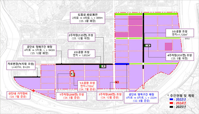 2025년에는 도로 확장 2곳(도동로·공단로), 주차장 조성 2곳(286면), 소공원 조성 2곳(2780㎡) 등 상평산단 내 기반 시설을 순차적으로 재정비하여 노후 산업단지 내 고질적인 갓길 불법 주·정차 및 교통 정체, 주차 공간 부족 등의 문제를 완화하여 도심지 노후 산업단지의 경쟁력을 강화해 나갈 예정이다.
