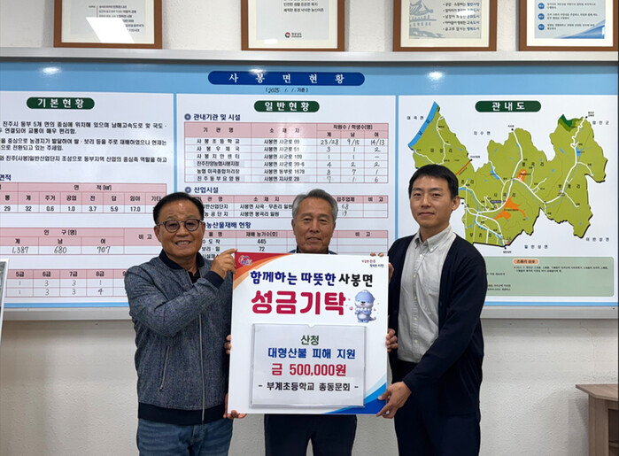 진주시 사봉면 구)부계초등학교 총동문회(회장 남을현)는 23일 경남 산청 산불 피해 지역의 신속한 복구와 이재민을 위해 성금 50만 원을 기탁했다.