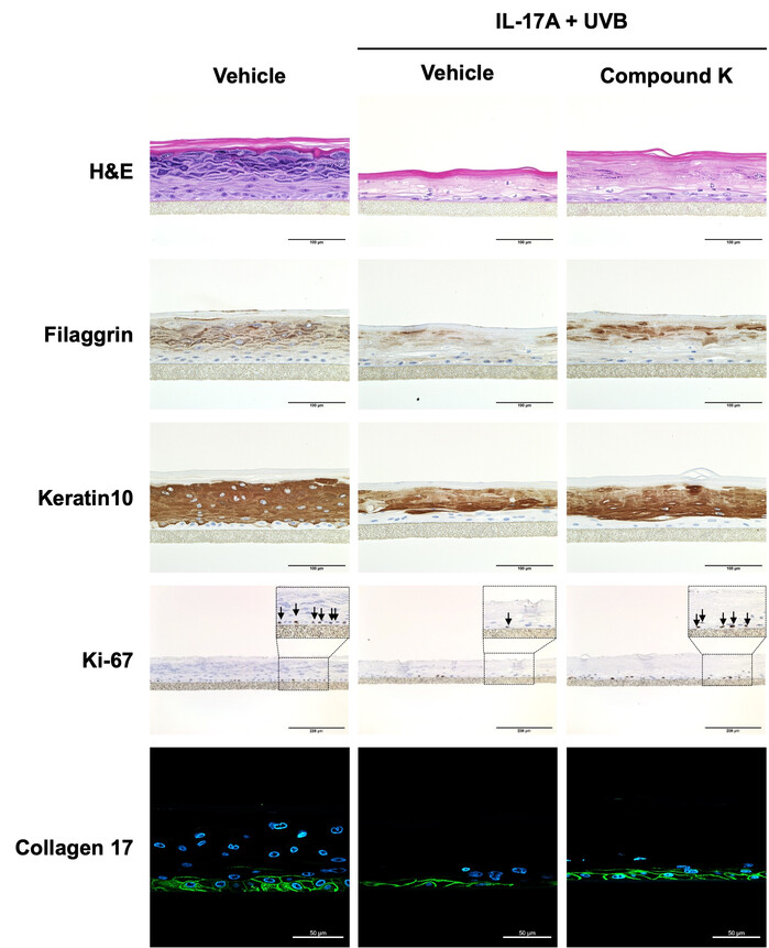 피부 가속 노화는 염증과 호르몬 변화 등의 내인성 요인, 자외선·미세먼지와 같은 외인성 요인의 복합 작용에 의해 촉진된다. 아모레퍼시픽 R&I센터는 이번 연구에서 내인성 노화 요인으로 염증성 사이토카인 Interleukin-17A(IL-17A)를, 외인성 노화 요인으로 자외선(UVB)을 활용한 노화 분석 시스템을 구축했다. 연구팀은 IL-17과 UVB의 동시 자극이 염증성 노화 현상을 증폭시키고, 피부 표피의 노화를 가속한다는 사실을 확인할 수 있었다. 또한 관련 시스템을 활용해 강력한 항염 효능을 지닌 인삼의 희귀 사포닌 진세노믹스™가 염증성 사이토카인의 생성을 효과적으로 억제하고, 노화로 인해 손상된 표피의 기능을 정상화시키는 효능도 밝혀냈다.