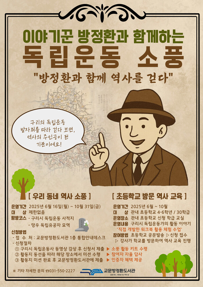 이 사업은 경기도 주관의 「광복 80주년 기념 문화사업」 시군 공모에 선정되어 도비 5,200만원을 지원받아 추진된 것으로, 구리시의 역사·문화 자원을 발굴하여 시민들과 함께 체험하는 내용으로 기획됐으며, 세부 내용은 ▲‘이야기꾼 방정환’이 들려주는 구리시 독립운동사 영상 감상 ▲구리시 독립운동 사적지 및 망우 독립유공자 묘역 탐방 ▲초등학교 방문 역사 교육 등이다.