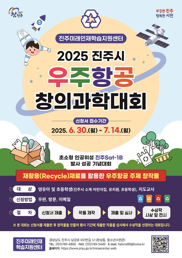 진주미래인재학습지원센터는 유아와 초등학생을 대상으로 ‘2025년 진주시 우주항공 창의과학대회’를 개최한다.