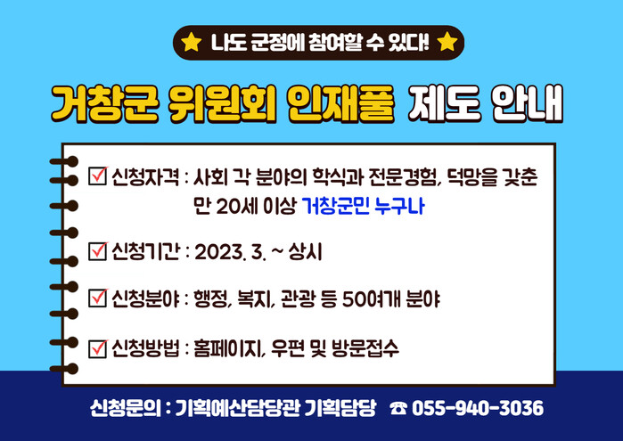 구인모 거창군수는 “인재풀 제도 시행으로 다양한 분야의 인재들을 확보해 우리 군 위원회가 더욱 활성화되고 군정 발전에도 기여하길 바란다”며 “평소 군정에 관심을 두고 직접 참여해 보고 싶었던 역량 있는 군민들의 많은 신청 바란다”고 말했다.