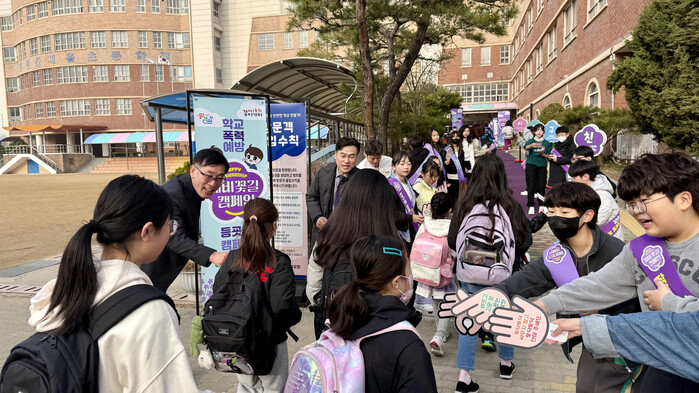 제비꽃길 캠페인은 등굣길에 ‘우정’을 상징하는 보랏빛 길을 함께 걸으며 학교폭력 예방의 중요성을 되새기는 활동으로 학생들은 하이파이브, 학교폭력 예방 문구 읽기, 친구에게 엽서 쓰기 등의 활동에 참여한다.