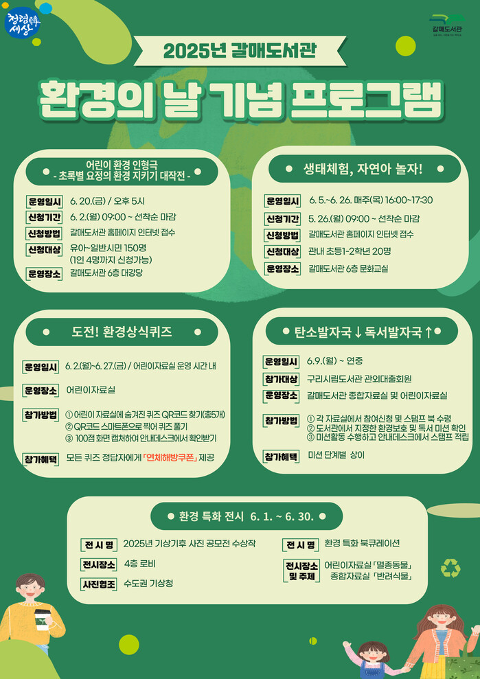 이 외에도 어린이 자료실 내에 숨겨진 QR코드를 찾아 환경 퀴즈를 풀어보는 ‘도전! 환경 상식 퀴즈’, 환경보호와 독서 활동 미션 수행을 통해 환경보호를 실천하고 혜택도 받는 ‘탄소발자국↓ 독서발자국↑’, 2025년 기상 기후 사진 공모전 수상작 전시, 환경 특화 도서 추천(북큐레이션) 오프라인 전시 등을 통해 시민들에게 다양한 즐길거리와 볼거리를 제공한다.