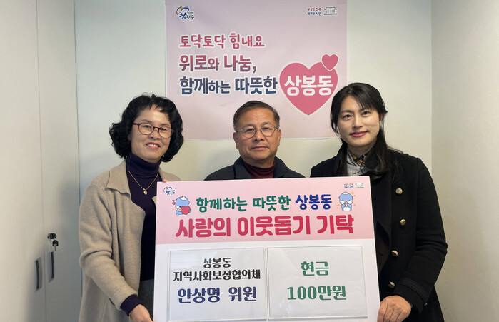진주시 상봉동 지역사회보장협의체 안상명 위원은 16일 겨울을 맞아 관내 도움이 필요한 이웃들에게 전달해달라며 현금 100만 원을 상봉동 행정복지센터에 기탁했다.