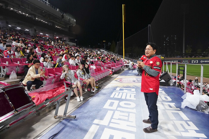 [광주=정찬남 기자] 강기정 광주광역시장이 25일 오후 광주기아챔피언스필드에서 열린 '한국시리즈 3차전 KIA 타이거즈와 삼성 라이온즈의 원정경기 홈 응원전'에 참석해 팬들에게 응원메시지를 전하고 있다./광주광역시 제공