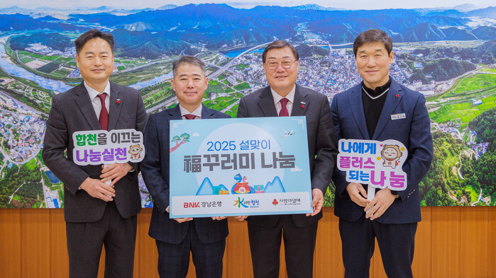 유성호 경남은행 합천지점장은 “설 명절을 앞두고 어려운 이웃들이 다함께 따뜻하고 풍요로운 명절을 맞이할 수 있길 바란다”며 “앞으로도 나눔을 통해 곳곳에 따뜻한 마음을 전하고 싶다”고 말했다.