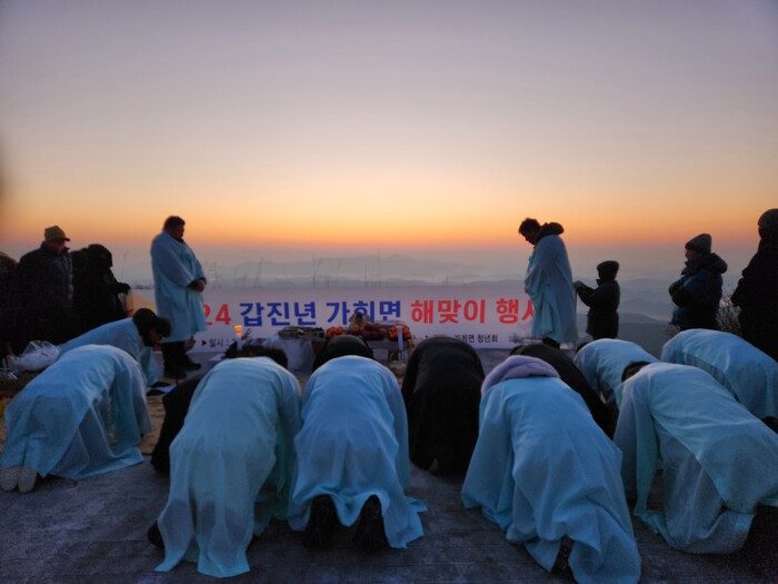 이날 행사는 갑진년의 첫해가 뜰 무렵에 맞춰 가회면민의 안녕을 기원하는 기원제를 시작으로 함께한 지역주민들과 관광객들에게 새해 덕담을 건네며 떡과 과일을 나눴다.