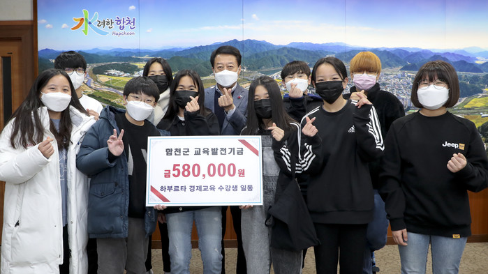 이에 문준희 이사장은 “어린 학생들이 힘들게 번 수익금을 선뜻 기탁한 것이 대견하면서도 감사하다. 기탁해주신 마음을 받들어 합천교육발전을 위해 소중하게 사용하겠다”며 감사의 뜻을 전했다.
