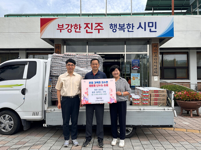 한편 금포영농조합법인은 평소 진주시 소재 복지시설 5곳에 꾸준한 기부를 통해 소외된 이웃을 위한 따뜻한 나눔 활동을 펼치고 있으며, 지난 24일 수해피해를 입은 진주시민을 위해 계란 1000판(환가액 700만 원 상당)을 기탁한 바 있다.
