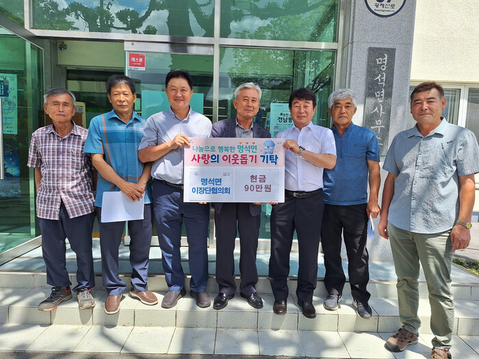 진주시 명석면 이장단협의회(회장 박성수)는 18일 최근 집중호우로 어려움을 겪고 있는 이웃들을 돕기 위해 성금 90만 원을 명석면사무소에 기탁했다.