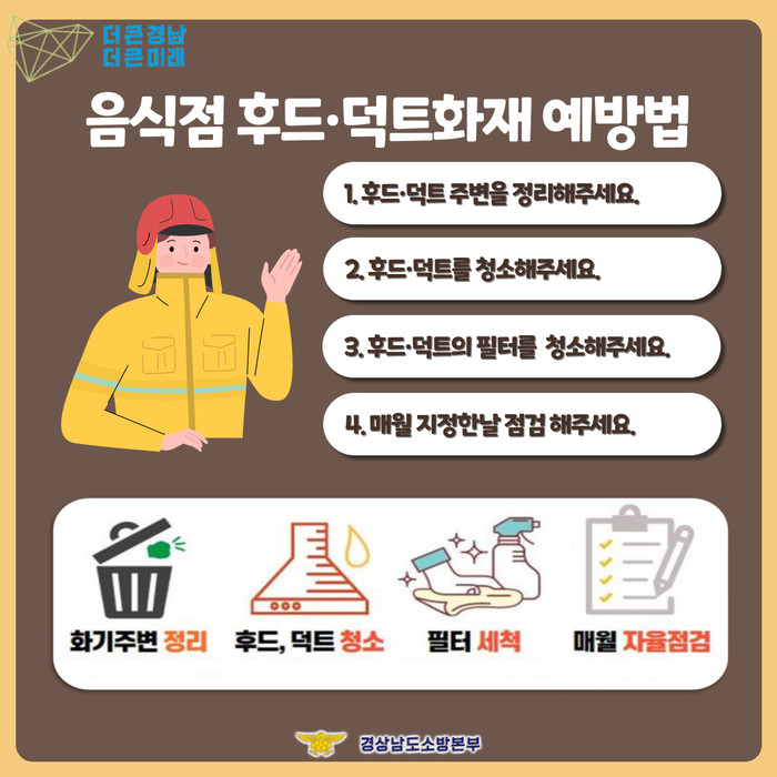 덕트ㆍ후드 화재를 예방하기 위해선 ▲주방설비에 부속된 배기 덕트는 0.5㎜ 이상 강판 등 불연재료 설치 ▲기름 제거 필터 설치 및 정기적인 주방후드 및 배기덕트 기름 찌꺼기 청소 등의 실천이 필요하다. 또 화재를 대비해 주방자동소화장치를 설치하고 K급 소화기를 함께 비치해야 한다.