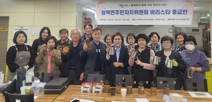 박은숙 쌍책면장은 “이번 바리스타 중급반을 통해 추후 관내에 조성될 지역카페에서 봉사할 바리스타들을 직접 양성할 수 있어 기쁘다”며 “바리스타 중급반이 건강한 여가 선용과 잠재능력 개발에 기여하길 바라며, 지역발전을 위해 항상 노력해주시는 주민자치위원회와 수강생분들을 위해 행정에서도 아낌없이 지원하겠다”고 말했다.