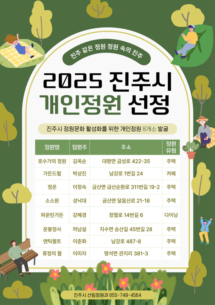 국가정원 지정을 목표로 하고 있는 진주시는 생활 속 정원문화 확산과 정원탐방 등 정원관광 자원으로 활용하기 위해 개인정원 발굴 및 선정사업을 지속적으로 추진해오고 있다. 지난 2022년 15곳의 우수 개인정원을 선정한 것을 비롯해 2023년 13곳, 2024년 8곳을 발굴해 우수정원으로 선정했다.