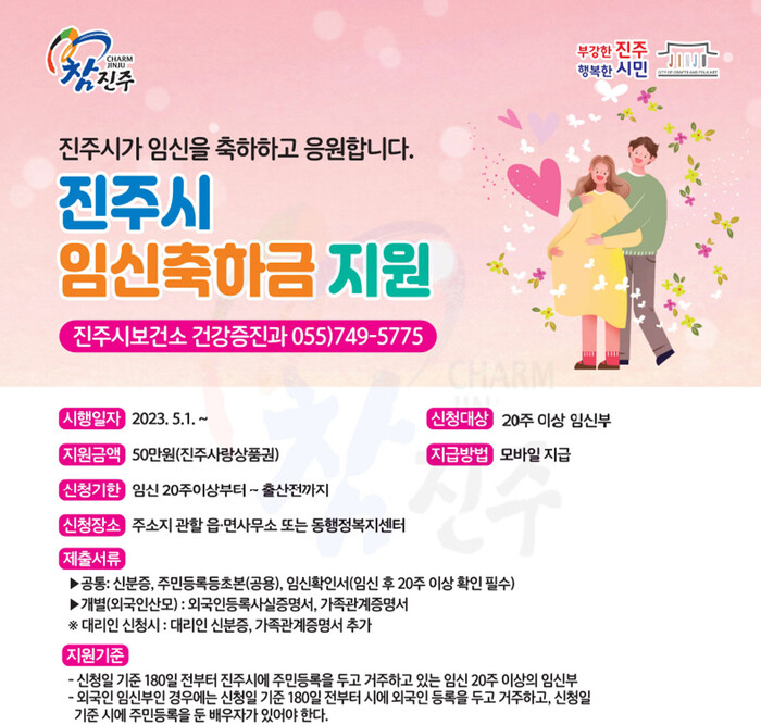 진주시는 임신을 축하하는 사회적 분위기를 조성하고 임신초기에 소요되는 경제적 지원 강화를 통해 저출산 극복 및 출산장려를 위한 임신축하금 지원 사업을 시행하고 있다.