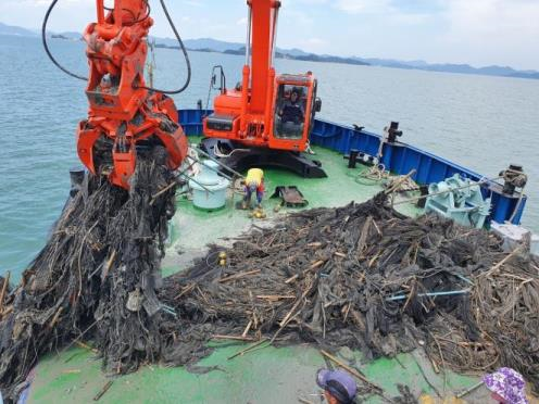 | ▲ 2021년 6월, 어항남해3호 여수시 여자만 해역 해양쓰레기 긴급수거 모습(출처=한국어촌어항공단) |